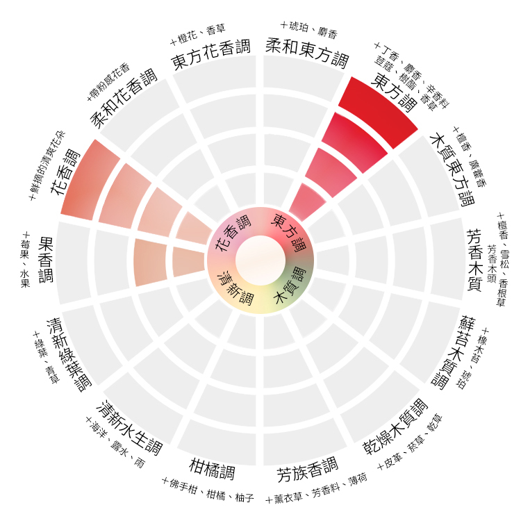 基底的香氣是玫瑰的花香+香草,肉桂味道是點綴的效果並不是主角,讓這股香氣帶上甜味,而野薑像是中和整體甜蜜感的效果