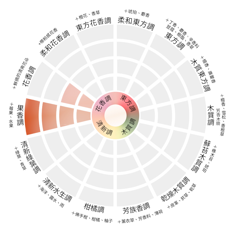 整體以稍稍甜蜜的水果香氣為主體,從熟透的蘋果到甜蜜的梨子,香氣再延伸到清爽的莓果。如同歐系香氛特有的氣質,這一款雖為滿滿的果香,也不會過於甜蜜濃烈,而是將各種水果香氣以剛剛好的比例融合成一股舒服的氣息。