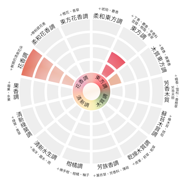 花香調/玫瑰、天竺葵、薰香、紫羅蘭、廣藿香、勞丹脂、安息香