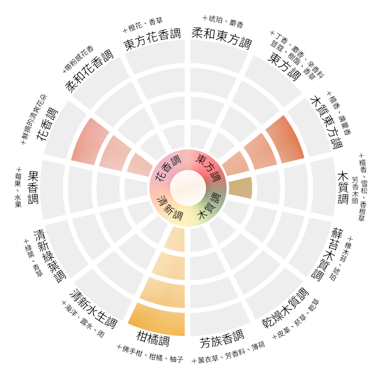 充滿活力的佛手柑香氣與柔軟的廣藿香調氣味結合,在慵懶柔柔的東方調中帶有一絲熱情的柑橘調,兩個截然不同的調性找到一個平衡感