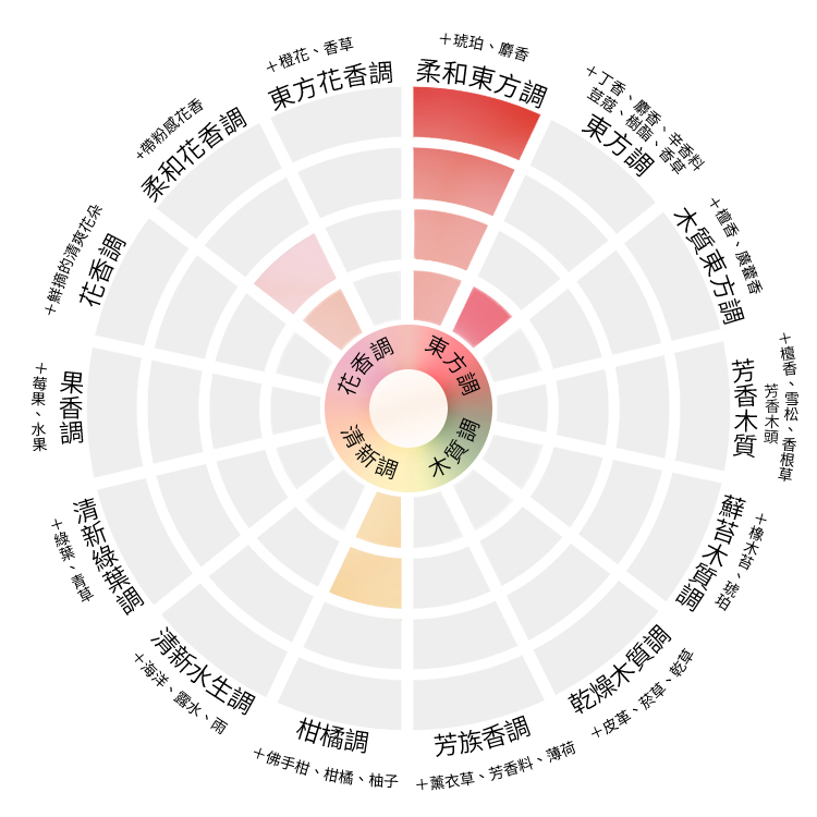中調:橙花、玫瑰、生薑、肉桂、百合、茉莉