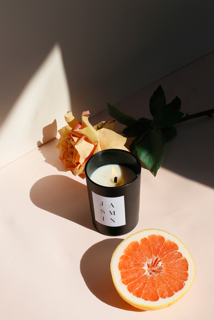 霧面的黑玻璃瓶身,搭配白底黑字的簡約標籤,白色外紙盒上斗大的浮雕黑字,呈現黑白配的簡約時尚質感。點燃時候的隱隱的燭光透過霧黑瓶子散出,放在各個室內空間都很優雅。