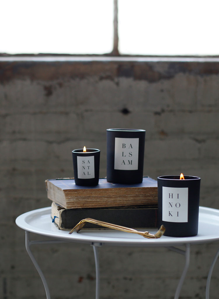 霧面的黑玻璃瓶身,搭配白底黑字的簡約標籤,白色外紙盒上斗大的浮雕黑字,呈現黑白配的簡約時尚質感。點燃時候的隱隱的燭光透過霧黑瓶子散出,放在各個室內空間都很優雅。
