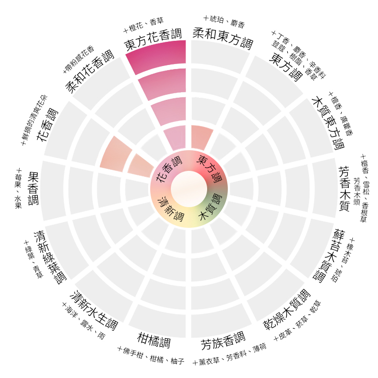 香氣結合鼠尾草、百合、橙花以及茉莉花,基底為橙花精油及琥珀混合而成。整體香氣屬於花香調,因為橙花會帶一些柑橘香,讓這款柔美的花香充滿活力!