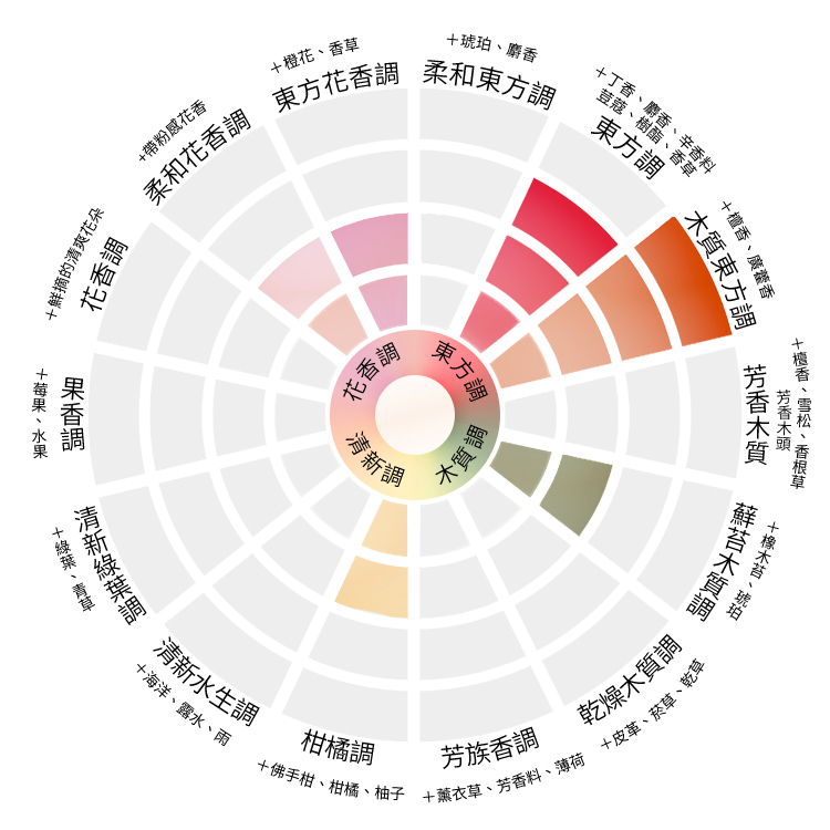 柑橘、綠葉以及清爽系的水果香氣,結合由康乃馨、玫瑰以及仙客來組成的花香氣味。基底是由香豆、麝香以及香草組成的綿柔香調。聞起來的氣味相當自然、乾淨,帶一絲柔柔軟軟布料的感覺,是很適合冬天慵懶時刻使用的氣味。
